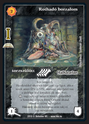 Rothadó borzalom (9): A mérgező pakli már régóta a 'majdnem működő' paklik közé tartozik, ez a kis finomság ill. a novemberben jövők remélhetőleg átlendítik a 'simán hoz 6/4-et, de akár nyerhet is' kategóriába (a követőjük pl. máig remek). A Rothadó borzalom sokak kedvence volt, nagyon gonoszul bánik az ellenféllel, csak már picit elavult. Ezért sokat nem is kellett tuningolni. A méregjelzők tetszés szerinti csökkentgetése már nála is nagyon hasznos, de jönnek majd más mérgező srácok is, akikkel kombózható. Szóval mérgező pakliba tuti hármat rakjatok, kár hogy a színe nem Sheran, de ez már így alakult.